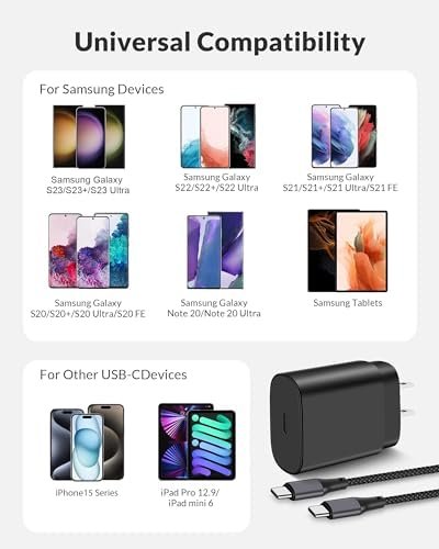 - [Widely Compatibility] Power Delivery 3.0 PD PPS Type C fast charger kit compatible with Samsung Galaxy S23/S23+/S23 Ultra/S22/S22+/S22 Ultra/S21/S21+/S21 Ultra/S20/S20+/S20 Ultra/S10 5G/Z Fold 3/Z Flip 3/Note 20/Note 20 Ultra/Note 10, iPad Pro 11/12.9 inch, iPad Mini 6, iPad Air 5/4, Android phone and more.