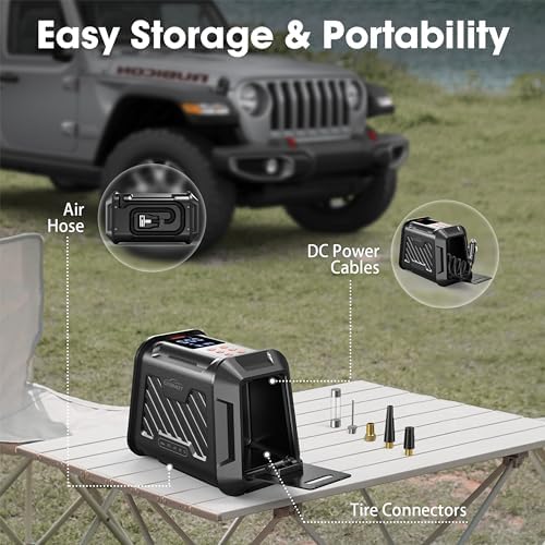 LARGE LCD DUAL DISPLAY – Our portable tire inflator features a dual digital LED display that shows real-time and preset pressure values, product status, and possible errors. The advanced chip ensures accurate pressure control and monitoring for safe inflation. Say goodbye to guesswork with our user-friendly 12v air compressor. (Please ensure that the preset pressure is higher than your tire’s current pressure).