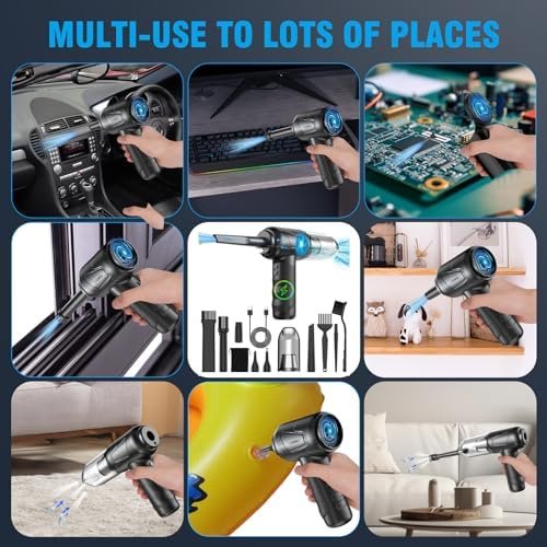 - Multi-use Air Dust Collectors and Vacuum Cleaners. Made with blowing-suction design and there are 6 nozzles special for multiple usages.Up to 600000RPM and 12000PA wind can effectively deep clean, . Perfect for car, computer, keyboard, window crannies, sofa, workshop, etc. Not only can you use it for cleaning, but also can use it to inflate your swimming ring, air bed etc. Definitely a must-have gadget for home and office.