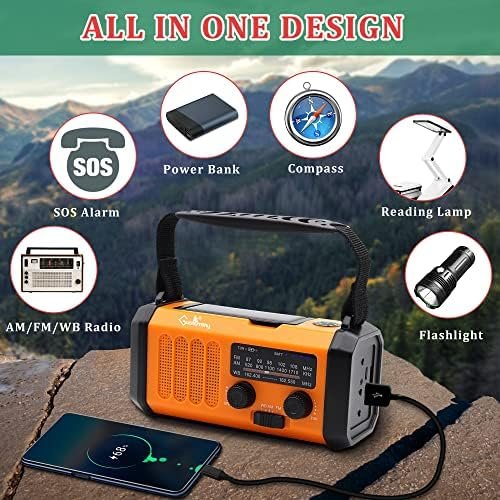 - Life Saver Weather Radio with Compass & SOS Alarm: When you’re in danger with body can’t move and cry for help isn’t loud enough, press the SOS button of this emergency hand crank solar radio, it will send out a 115dB SOS alarm and flashlight to catch the attention of rescuers. We also embedded a compass at the top of the product to orient yourself while on an adventure. All of these increase your chances of being rescued in the event of emergency.