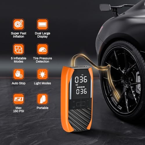 【Accurate Pressure Detecting & Auto Stop】- This tire inflator with Pressure Gauge featuring an upgraded high-precision chip,our car tire air pump provides accurate air pressure detection with an impressive precision error of only 0.05psi. Dual Large LCD digital display enables you to read the real-time pressure and the preset pressure at just a glance. The auto air tire inflator automatically stops once it reaches the preset pressure value,making it simple and safe.No need to worry about over inflating.