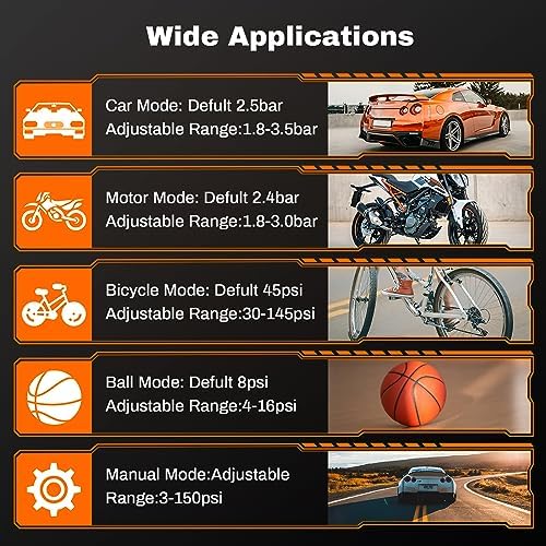 【5 Inflation Modes】- The portable air compressor for car tires offer 4 preset inflation modes(bicycles, motorcycles, cars, and balls) and 3 preset units (PSI, KPA, BAR ). Additionally, the manual mode allows you to set precise pressure values between 3-150psi, just one click,it is easy to operate and meet your various inflation needs.