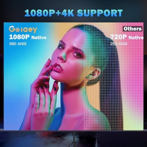 - [PROJECTOR 4K SUPPORTED WITH 100” PROJECTOR SCREEN] Goiaey native 1080P HD projector has stunning 16:9 & 4:3 projection, improving 20% brightness with low noise. With 4K resolution and 20000:1 contrast ratio, GO1 movie projector delivers crystal clear widescreen imaging. Bonus with included 100″ anti-light outdoor projector screen improves the contrast ratio by 20% for a more colorful image to protect our eyes, Enjoying a really true movie theater experience at home with your family.