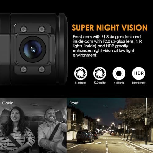 【Infrared Night Vision Interior Car Dash Camera for Drivers】Advanced sony sensor, F2.0 6-glass lens interior facing cam plus 4 IR LED lights greatly enhances night vision inside car at low light environment, making your driving more safer at night. F1.8 6-glass lens front facing cam and unique HDR video system automatically balance the light and dark areas of the video. Simply toggle the night vision modes by short pressing the power button of the car dash camera.